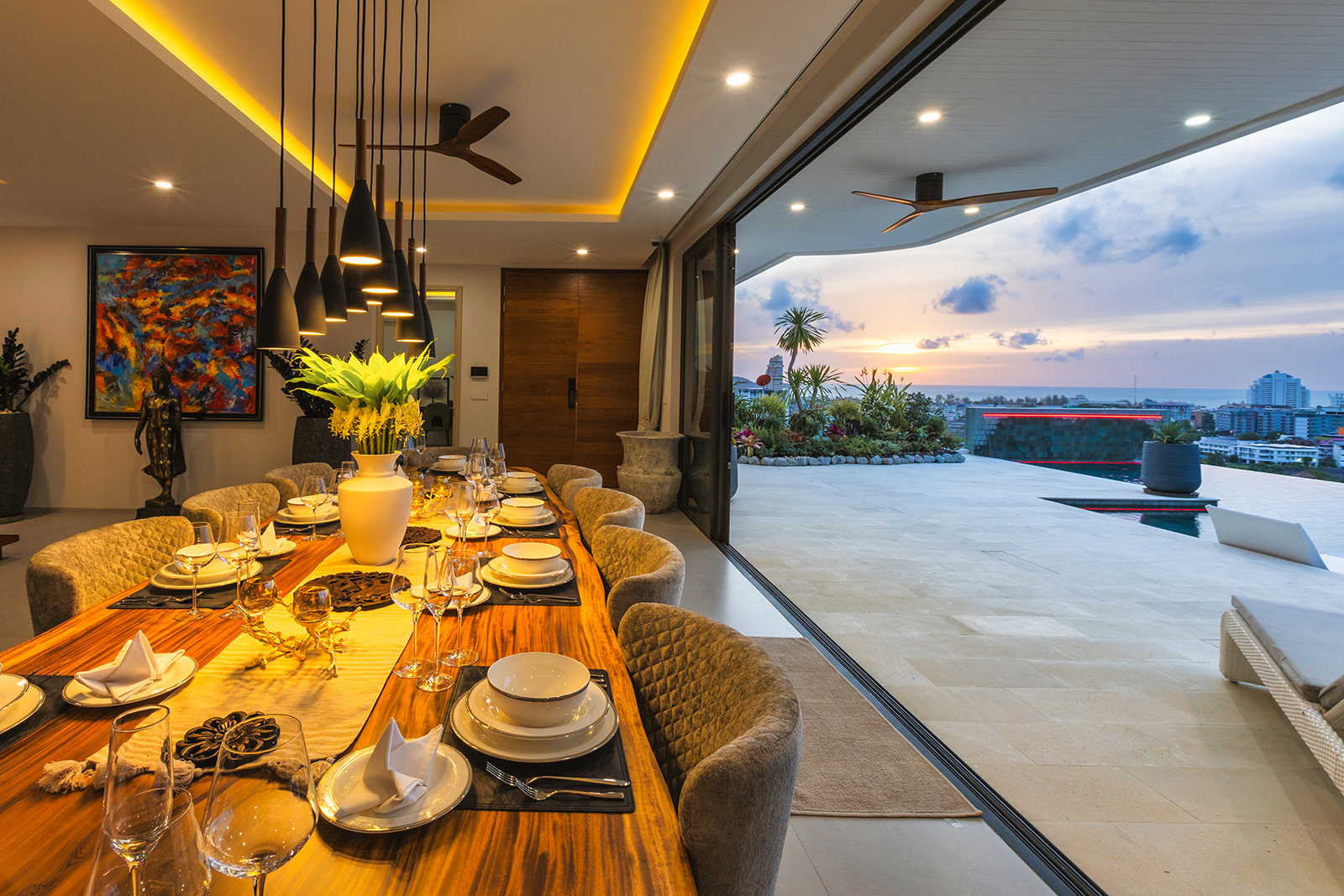 180 degree view, beautiful sunset in the evening and the house is fully equipped, modern, clean, new, beautiful, with a spacious living area, kitchen, swimming pool, city view, sea view in the same place, just a few kilometers down to the beach, very awesome.