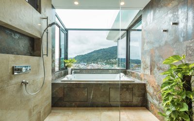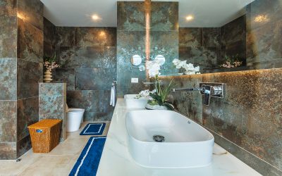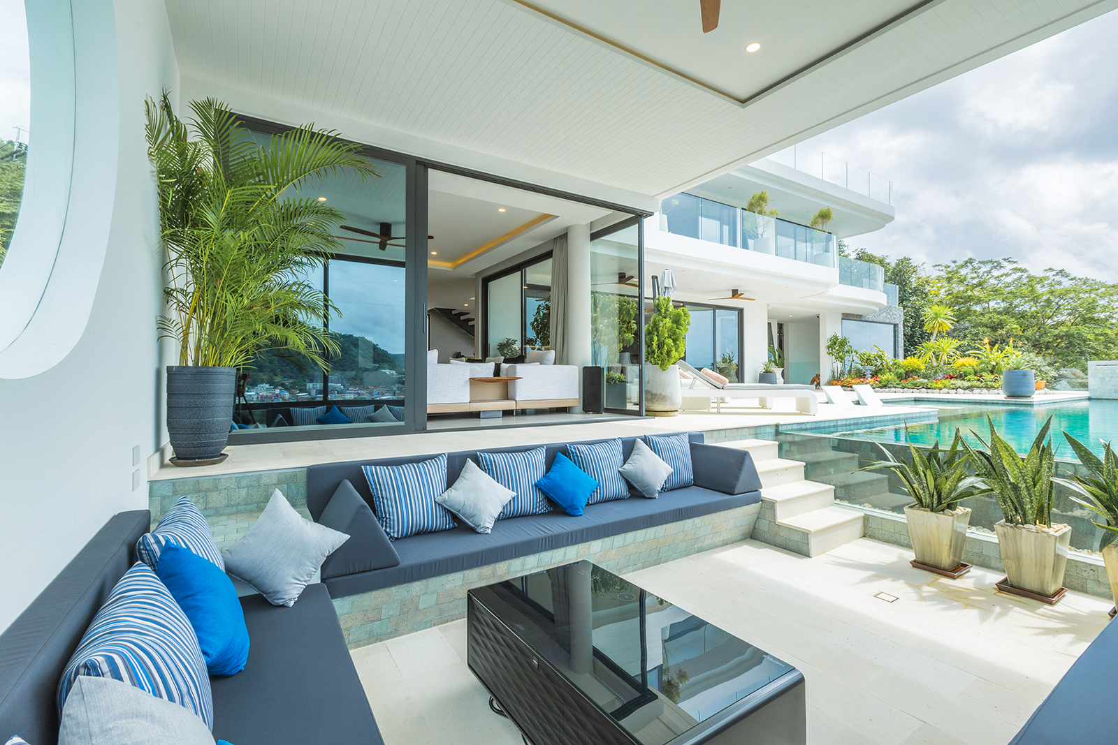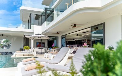 Imagine a beautiful luxury villa with five large bedrooms, located on a hill that offers breathtaking views of the crystal clear sea. The villa is surrounded by veranda, and well-kept garden tropical plants and palm trees. The large windows allow the natural light to illuminate every corner of the elegant and modern interior.