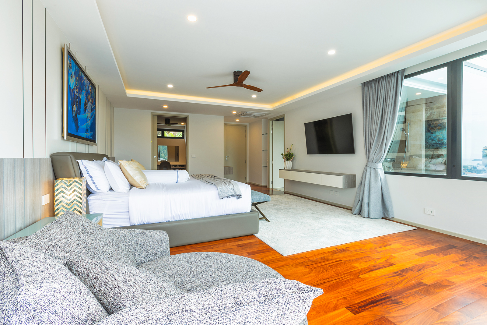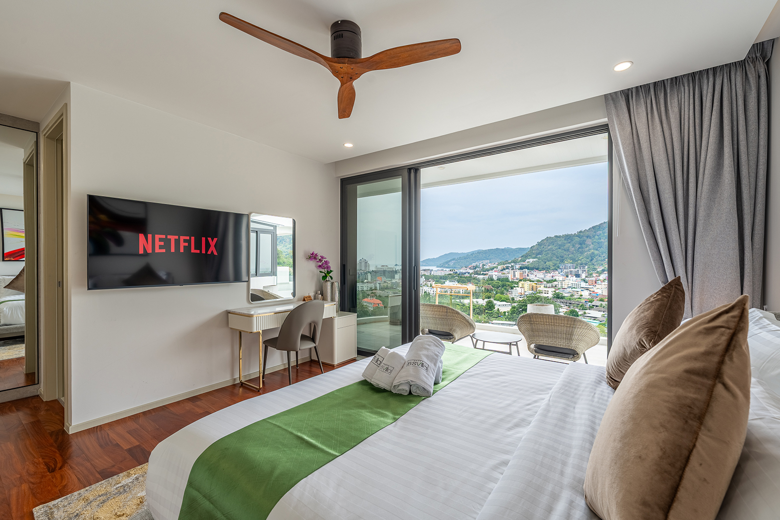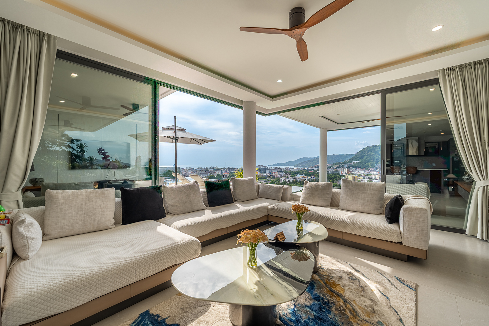 The living area is spacious, with refined furnishings and a fully equipped open kitchen and bar corner. Each bedroom has a private designer bathroom, panoramic balconies and fine finishes.