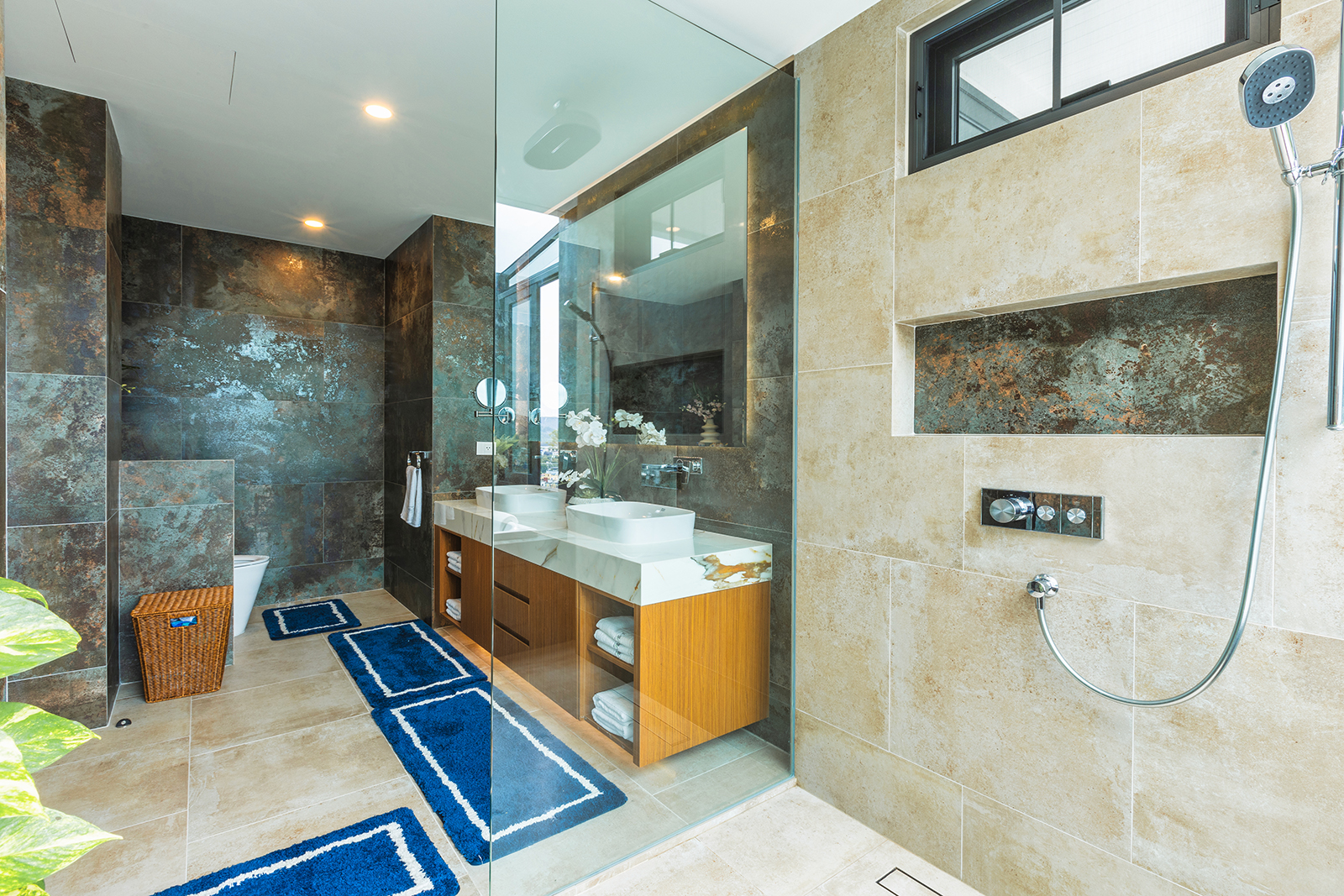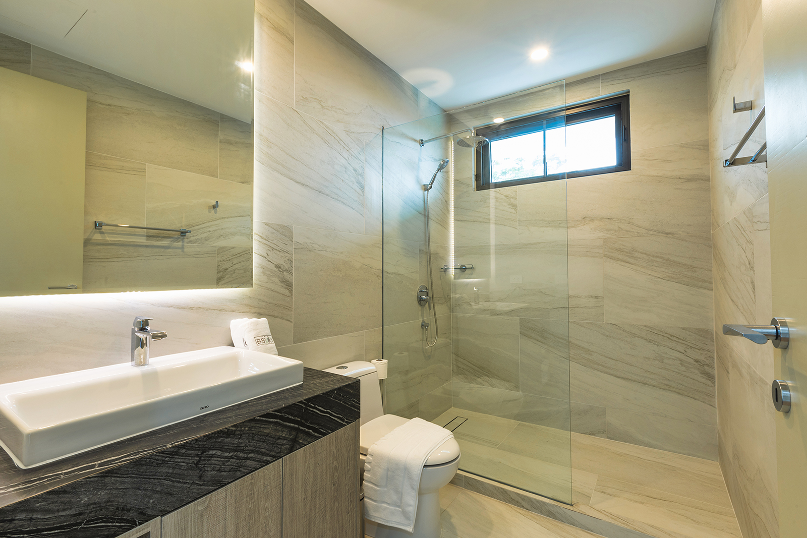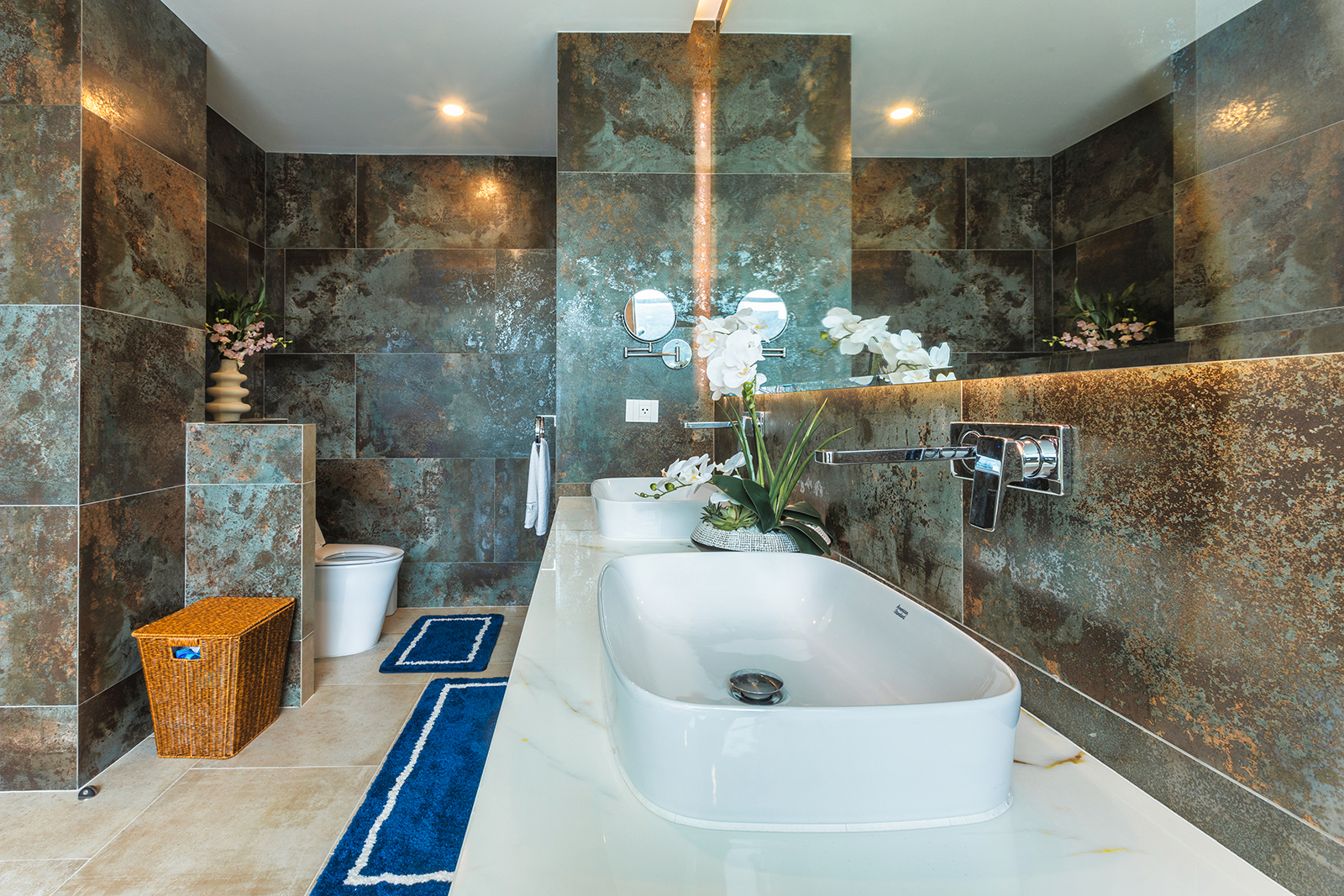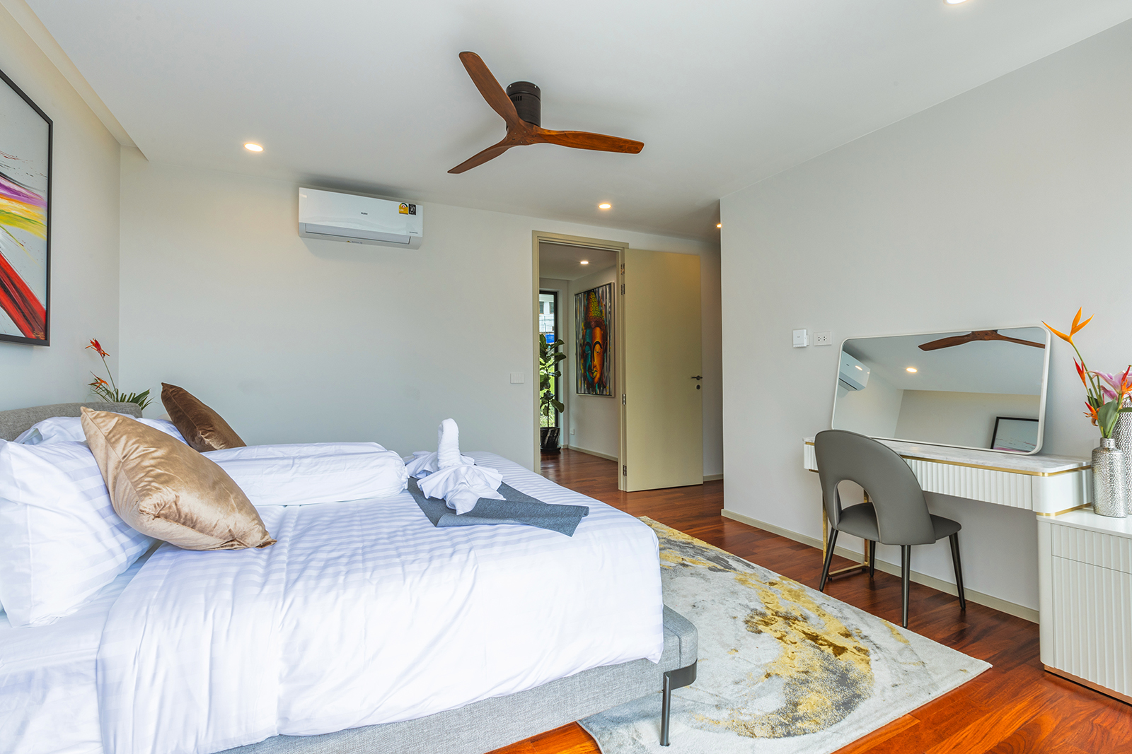 The living area is spacious, with refined furnishings and a fully equipped open kitchen and bar corner. Each bedroom has a private designer bathroom, panoramic balconies and fine finishes.